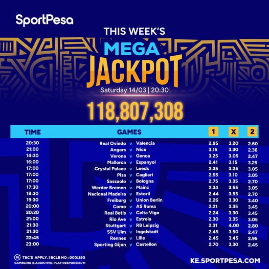Sportpesa Mega Games & Predictions: Ksh 118.8 M up for grabs From Saturday 14/03/2026
