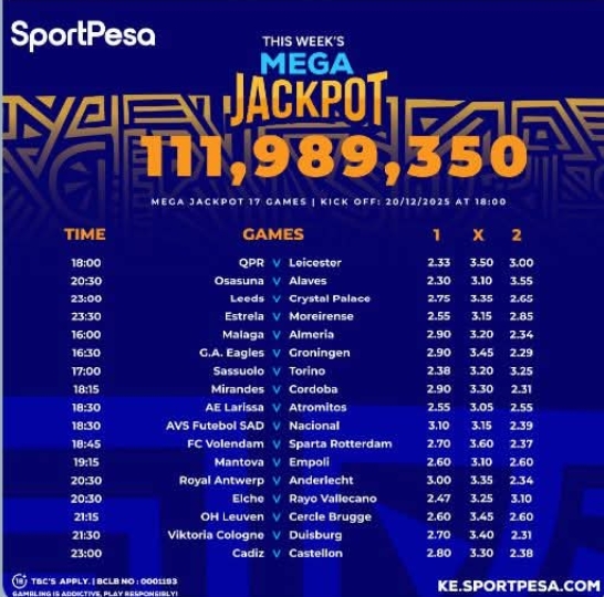 Sportpesa Mega Games & Predictions: Ksh 111.9 M up for grabs on 20/12/2025