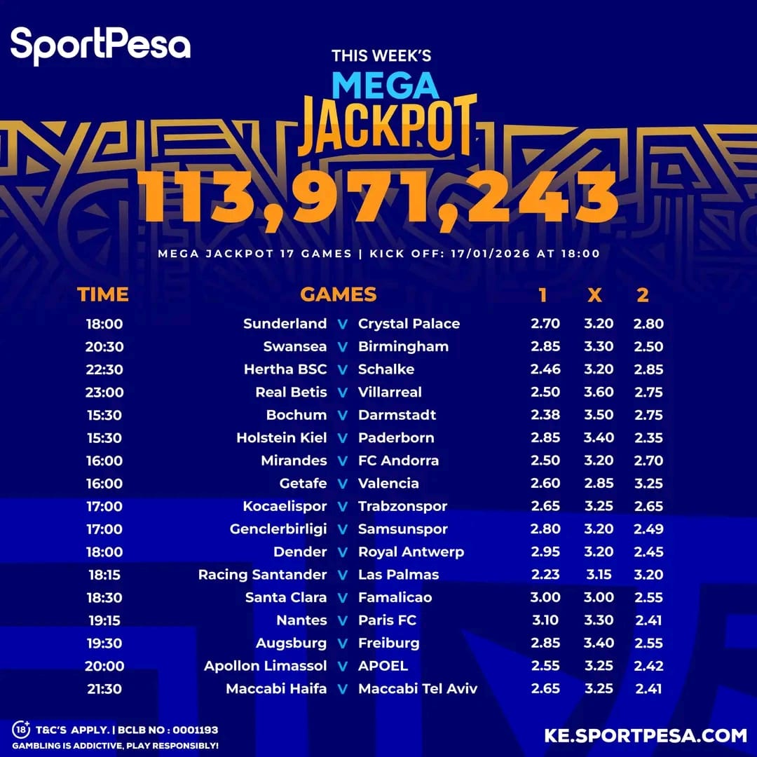 Sportpesa Mega Games & Predictions: Ksh 113.9 M up for grabs From Saturday 17/01/2026